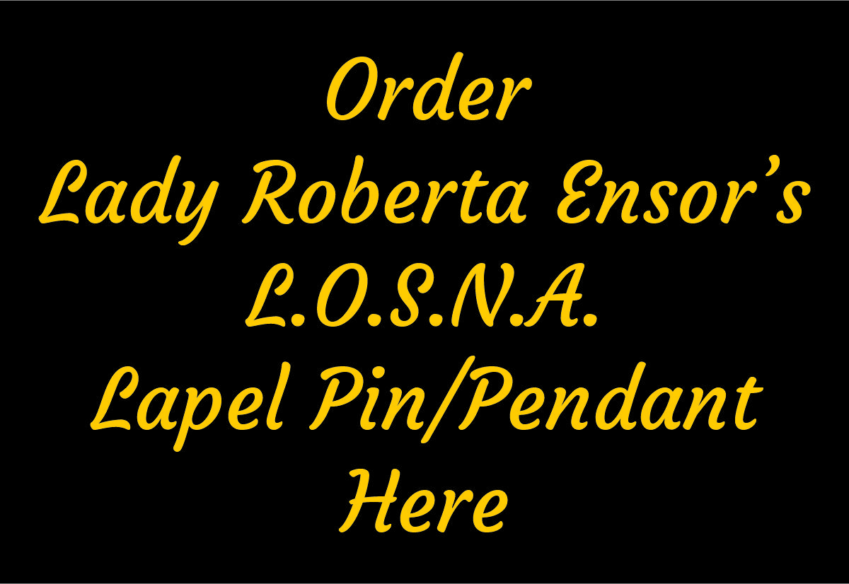 Lady Roberta Ensor's lapel pin with Post/Clutch and Loop for Pendant.  Pack of 25 pins priced at $1.36 each.  Ships via USPS Priority Mail Only.