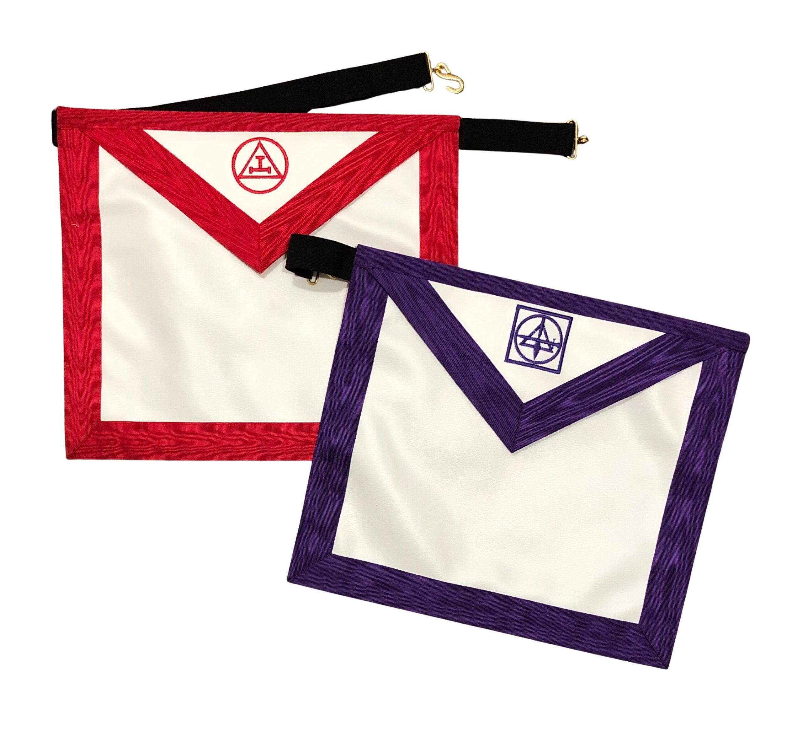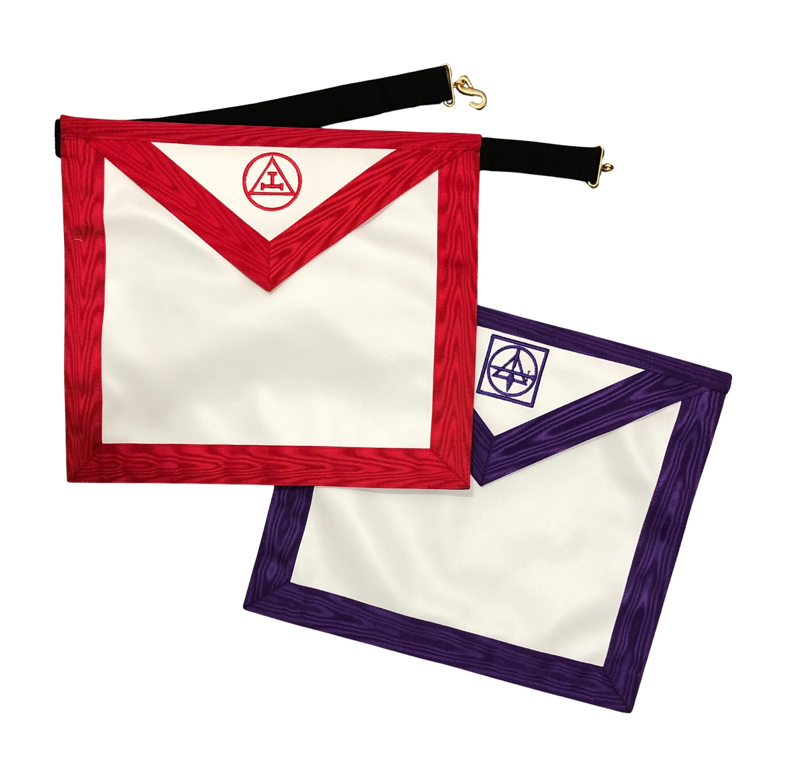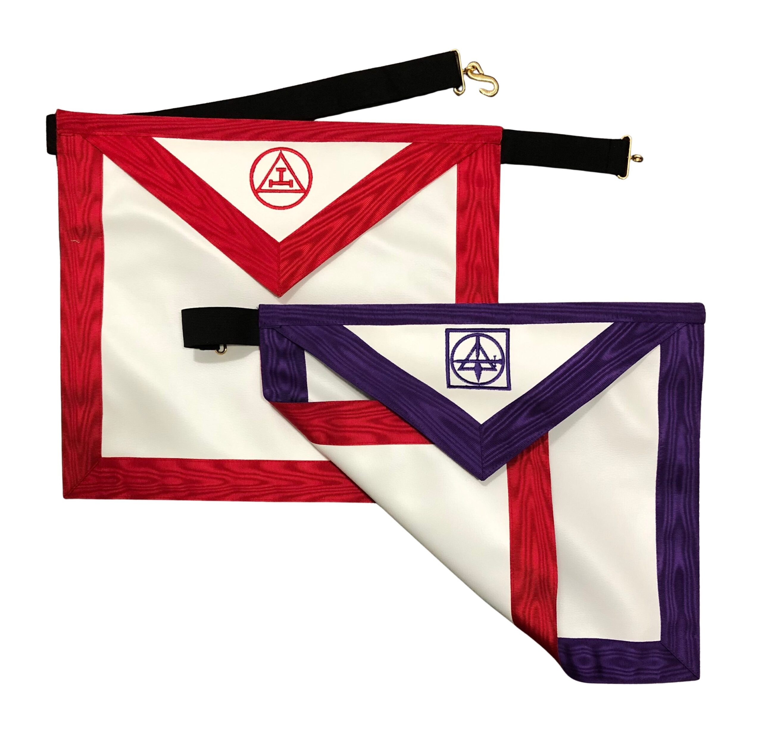 Two Aprons in One! Royal Arch Chapter and Royal & Select Master Dress Apron (Size: 13" x 15"); Machine embroidered with the Triple Tau emblem on flap on one side and Council emblem on the other; Imitation Leather body and flap; Red and Purple Satin Watered Grosgrain border; Comes standard with Black Elastic adjustable belt and Gold Plated Snake Hardware; Please allow 3-4 weeks for delivery if not in stock.