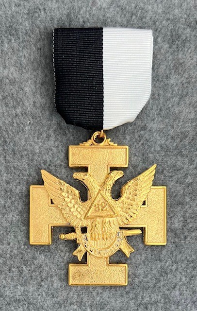 Scottish Rite 32nd Degree Double Headed Eagle on Teutonic Cross Jewel - Wings Up; Gold Plated; complete with Black & White Ribbon; Please allow 2-3 weeks for delivery if not in stock.