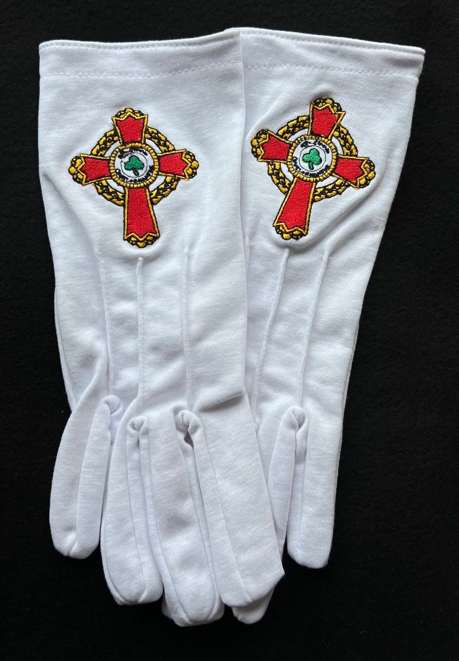 Cotton Gloves with Knight Commander Court of Honour Emblem; Full-fashioned, Snap-Wrist, White Cotton dress gloves with embroidered emblems. One size fits most. Hand wash with mild detergent in cold water; dry flat.