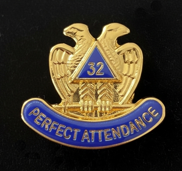 Scottish Rite 32nd Degree Perfect Attendance Lapel Pin; Measures 1/2"; Gold Plating with Blue enamel; Post with military clutch back; Poly bag
