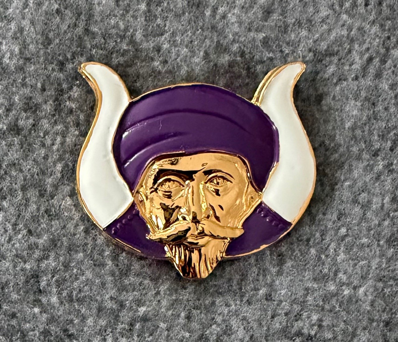 Grotto Mokanna Monarch Fez Emblem; Metal emblem in Gold plating with Purple and White enamels; Prong fasteners; Perfect to replace an old or damaged fez emblem