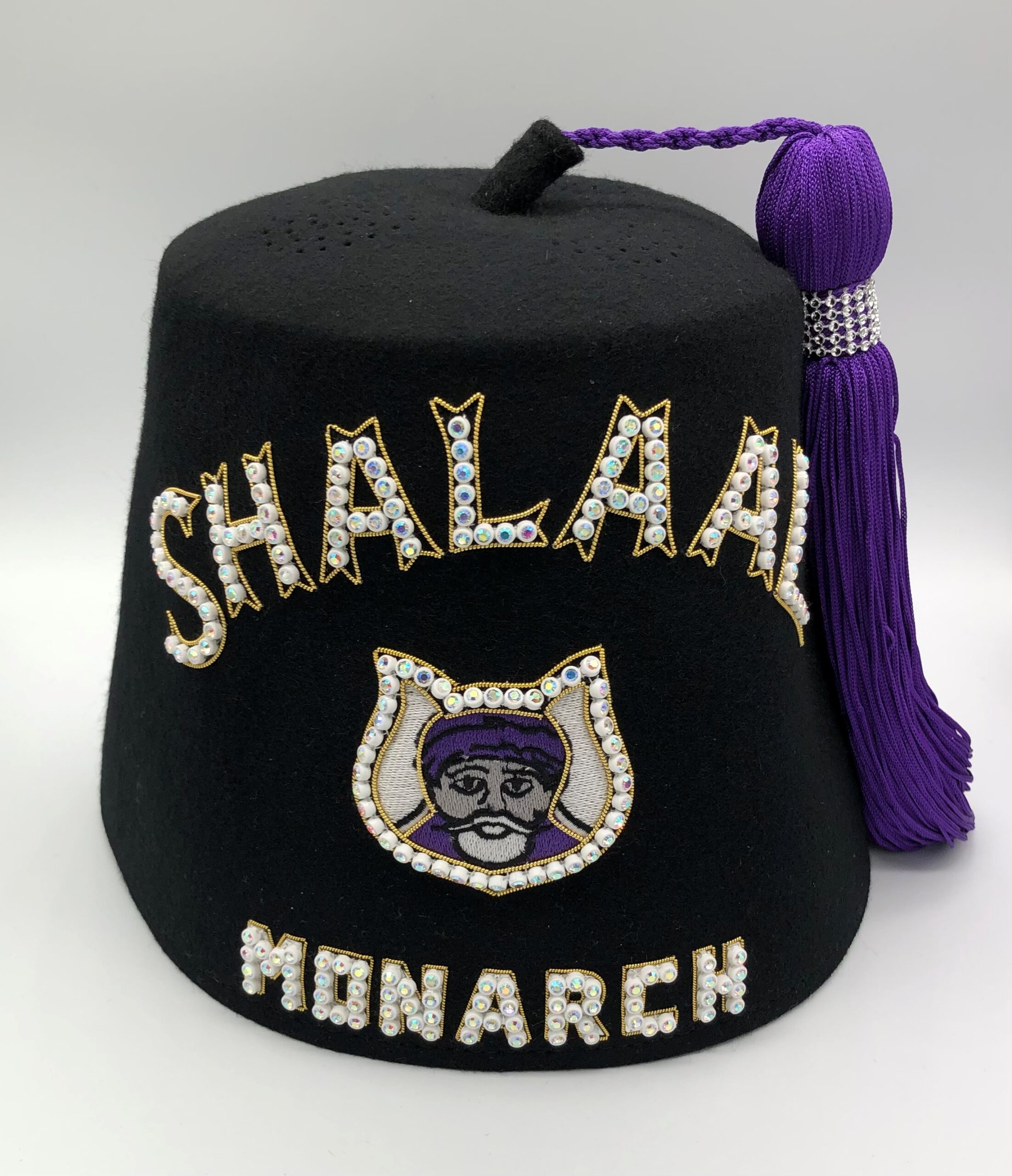Grotto Monarch Fez - Singled Jewel White Cup Rhinestones; Black, 100% Wool Felt Fez Body with Ventilated Top (Made in the U.S.A.); Leatherette Sweatband; Grotto Name and Mokanna Emblem Hand Embroidered in White Cup Rhinestones; 18" Purple Tassel with Rhinestone Holder; MONARCH embroidered in White Cup Rhinestones on bottom front; All fezzes are custom made to order and cannot be returned for refund; Please check with your Grotto with regard to proper style and lettering requirements; Production time and delivery is 4-5 weeks.