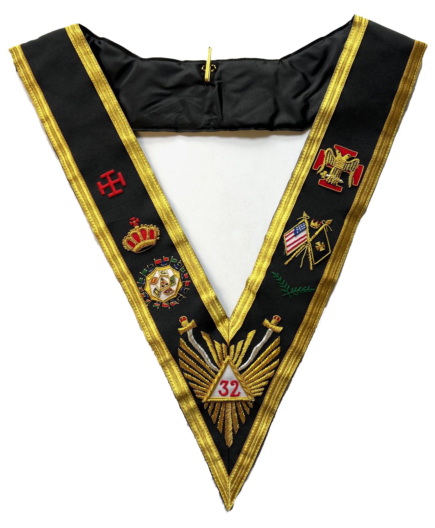 Scottish Rite 32nd Degree Embroidered Collar; Emblems are Hand Embroidered in beautiful Silk threads and Gold and Silver Bullion; Heavy Black Grosgrain Ribbon trimmed in metallic Gold lace; Black lining; Please allow 4-6 weeks for delivery if not in stock.
